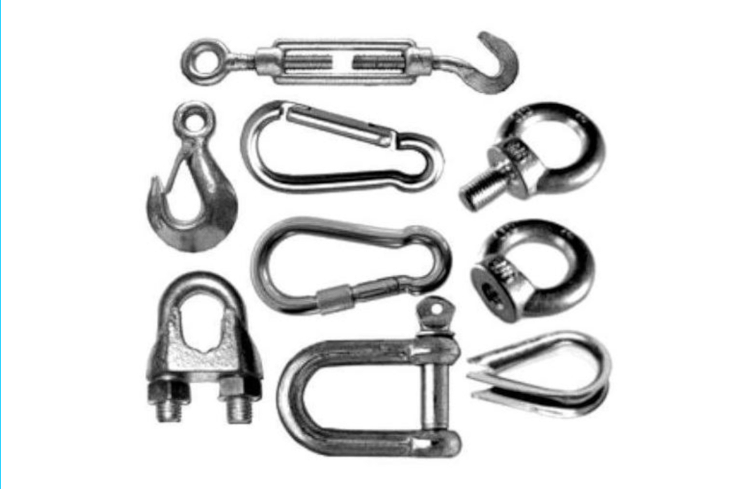 Такелажное оборудование: тросы, крюки, рым-болты, рым-гайки, коуши, зажимы, карабины.