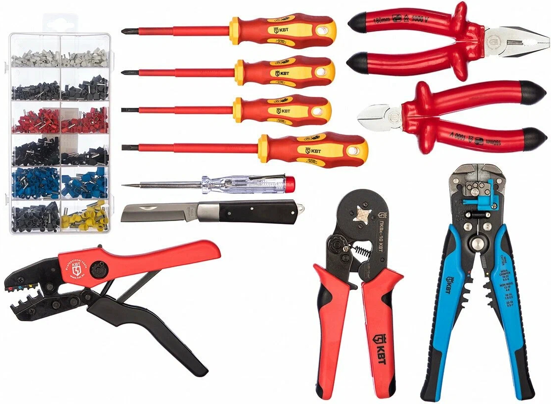 Кабели, клеммы, лампы, светодиодные светильники, розетки, батарейки, изолента.